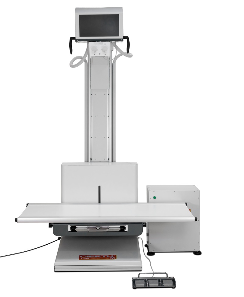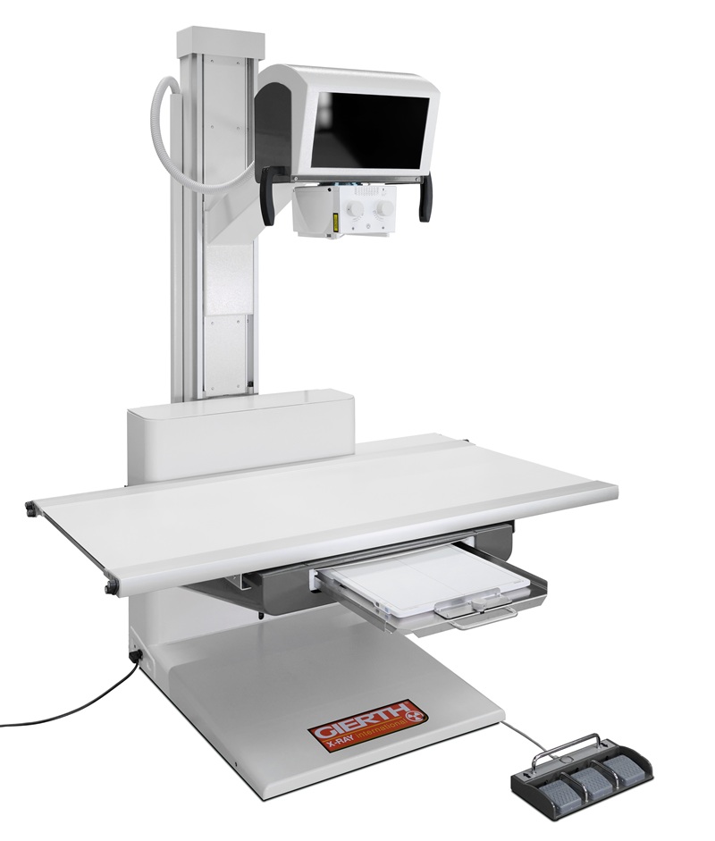 - Feststehende Säule mit einer höhenverstellbaren Röntgenröhre, einem Kollimator und einer Bedienkonsole
